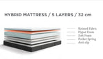 Die im Set enthaltene Hybrid-Matratze verfügt über eine Gesamthöhe von ca. 32 cm und besteht aus einem innovativen 5-Schichten-System. Diese Konstruktion kombiniert Komfortschaum und Taschenfedern und sorgt für eine optimale Balance zwischen Unterstützung und Liegekomfort.