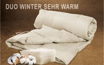 - Attraverso il La costruzione Duo , in cui due riempimenti sono collegati, crea un ulteriore Cuscino d'aria , che garantisce una tenuta particolarmente elevata Isolamento termico Ciò rende la coperta ideale per le fredde giornate invernali.